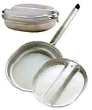 U.S. G.I. stainless steel mess kit. Two peice used as fry pan with steamer lid, dinner tray.